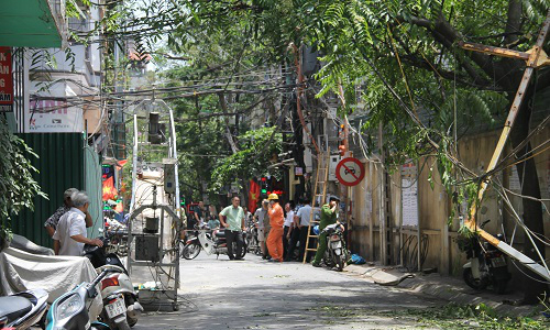 Tại hiện trường, trục thang nâng đổ sập, kéo theo nhiều cành cây, dây điện, dây cáp viễn thông. Vết máu của nạn nhân loang lổ dưới mặt đường.
