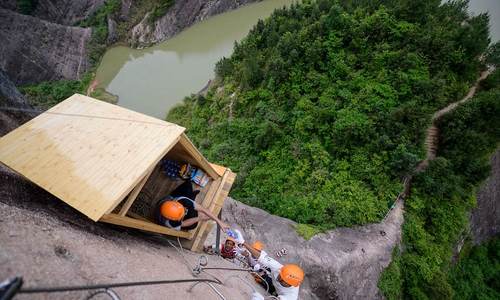 Cách mặt đất 100 m, cửa tiệm trên vách đá là một công trình trong dự án leo núi đá Feillada của công viên địa chất quốc gia Shiniuzhai.
