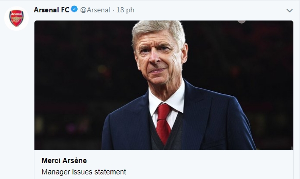 Đã không có quyết định sa thải nào từ phía lãnh đạo CLB Arsenal, mà đây là chính là lời từ chức của vị giáo sư kính mến. HLV Wenger nói: “Sau khi cân nhắc kỹ lưỡng và thảo luận với câu lạc bộ, tôi cảm thấy đó là thời điểm thích hợp để ra đi vào cuối mùa giải. Tôi rất biết ơn vì đã có đặc quyền để phục vụ câu lạc bộ trong nhiều năm đáng nhớ. Tôi quản lý câu lạc bộ với đầy đủ những cam kết của lãnh đạo đội bóng. Tôi muốn cảm ơn các nhân viên, các cầu thủ và những người hâm mộ đã khiến câu lạc bộ này trở nên đặc biệt“.