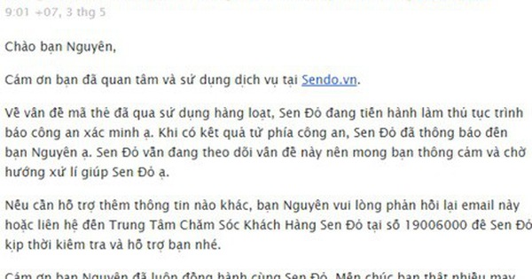 Sáng 03/05, Trung tâm chăm sóc khách hàng Sen Đỏ gửi email cho chị Yến với nội dung: “Sen Đỏ đang làm thủ tục trình báo công an xác minh. Khi có kết quả từ phía công an, Sen Đỏ sẽ thông báo đến bạn. Sen Đỏ vẫn đang theo dõi vấn đề này nên mong bạn thông cảm và chờ hướng xử lý giúp Sen Đỏ.”