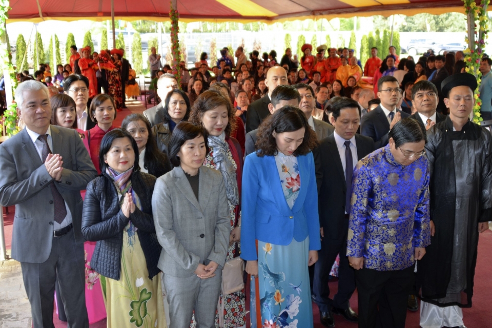 Trong không khí trang nghiêm, sau hồi chuông trống Bát Nhã, lần lượt các đoàn Đại sứ quán, các Hội người Việt Nam tại Ba Lan, Hội đồng hương Phú Thọ, đại diện cho những người con của quê hương đất Tổ, Thanh Hóa, Nghệ Tĩnh, Nam Định, Thái Bình, câu lạc bộ Hà Thành, Chùa Thiên Phúc… các tổ chức Cộng đồng Hội Người cao tuổi, Hội Doanh nghiệp, Hội Phụ nữ đã dâng hương và lễ vật tưởng nhớ các Vua Hùng gồm bánh chưng, bánh dày, bánh tét, các đặc sản vùng miền của địa phương.