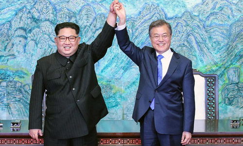 Lãnh đạo Triều Tiên Kim Jong-un (trái) và Tổng thống Hàn Quốc Moon Jae-in (phải) trong hội nghị thượng đỉnh liên Triều tại Panmunjom, Khu Phi quân sự liên Triều hôm 27/4. Ảnh: KCNA. |