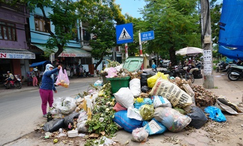 Bà Nguyễn Thị Xuân, tiểu thương ở chợ Thu Lộ chun mũi trước điểm đổ rác đã thành đống, nói: “Ngày thường chị em trong chợ đều bỏ rác gồm vỏ rau, củ, quả, hoa… vào thùng và được thu gom nhanh chóng. Bây giờ chờ mãi chẳng thấy xe rác đến”.