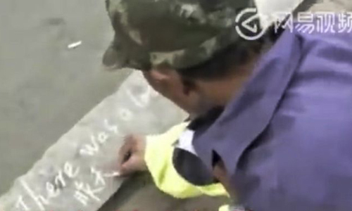 Một phóng sự trên kênh truyền hình Hắc Long Giang hôm 1/6 ghi lại hình ảnh ông Wang Shoushan trong bộ đồ công nhân ngồi bên lề đường viết tiếng Anh và bản dịch tiếng Trung lên vỉa hè ở thành phố Cáp Nhĩ Tân.