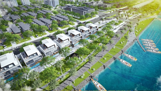 Bến du thuyền với cảnh quan rộng mở, nối liền phố đi bộ đầy cây xanh.