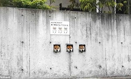 Ngoài nhiệm vụ trông nhà, ba chú chó Shiba Inu còn ngóc đầu ra khỏi ba lỗ vuông ở bức tường sát đường ở trong thành phố Shimabara, đảo Kyushu. Điều này tạo nên một khung cảnh dễ thương, thu hút nhiều người tìm đến xem.