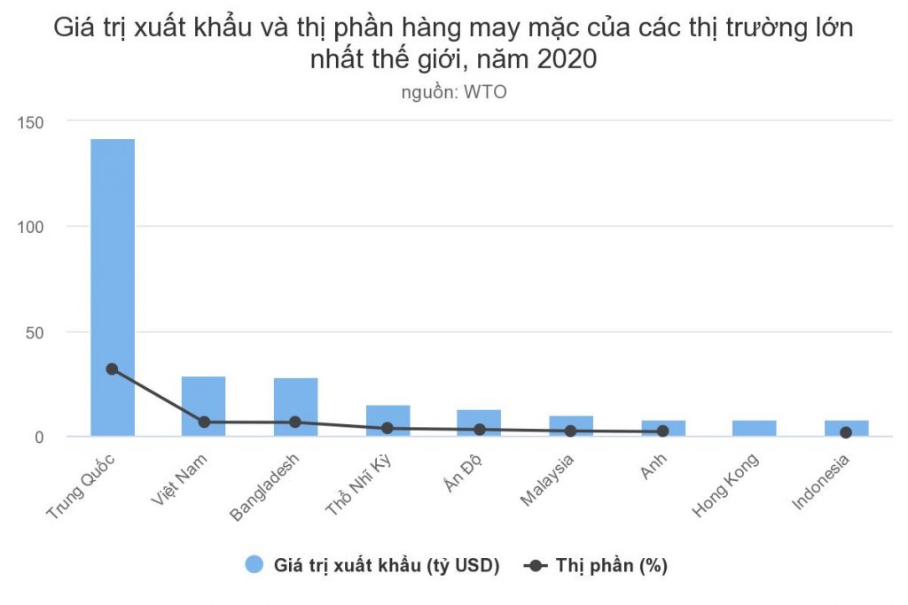 Xuất khẩu hàng may mặc của Việt Nam và Bangladesh đều giảm trong năm 2020 do Covid-19, nhưng xuất khẩu của Bangladesh giảm với tốc độ nhanh hơn, về mức 28 tỷ USD. Thị phần của Bangladesh trên thị trường may mặc toàn cầu giảm còn 6,3% trong năm ngoái. Theo xếp hạng của WTO, Bangladesh là nước xuất khẩu hàng may mặc lớn thứ hai thế giới kể từ năm 2010.